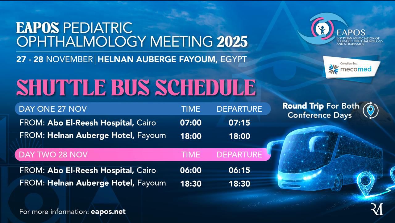 A shuttle bus will be available from Abu El Rish Children’s Hospital, Cairo to Helnan Auberge Hotel, Fayoum, round trip, for both conference days.